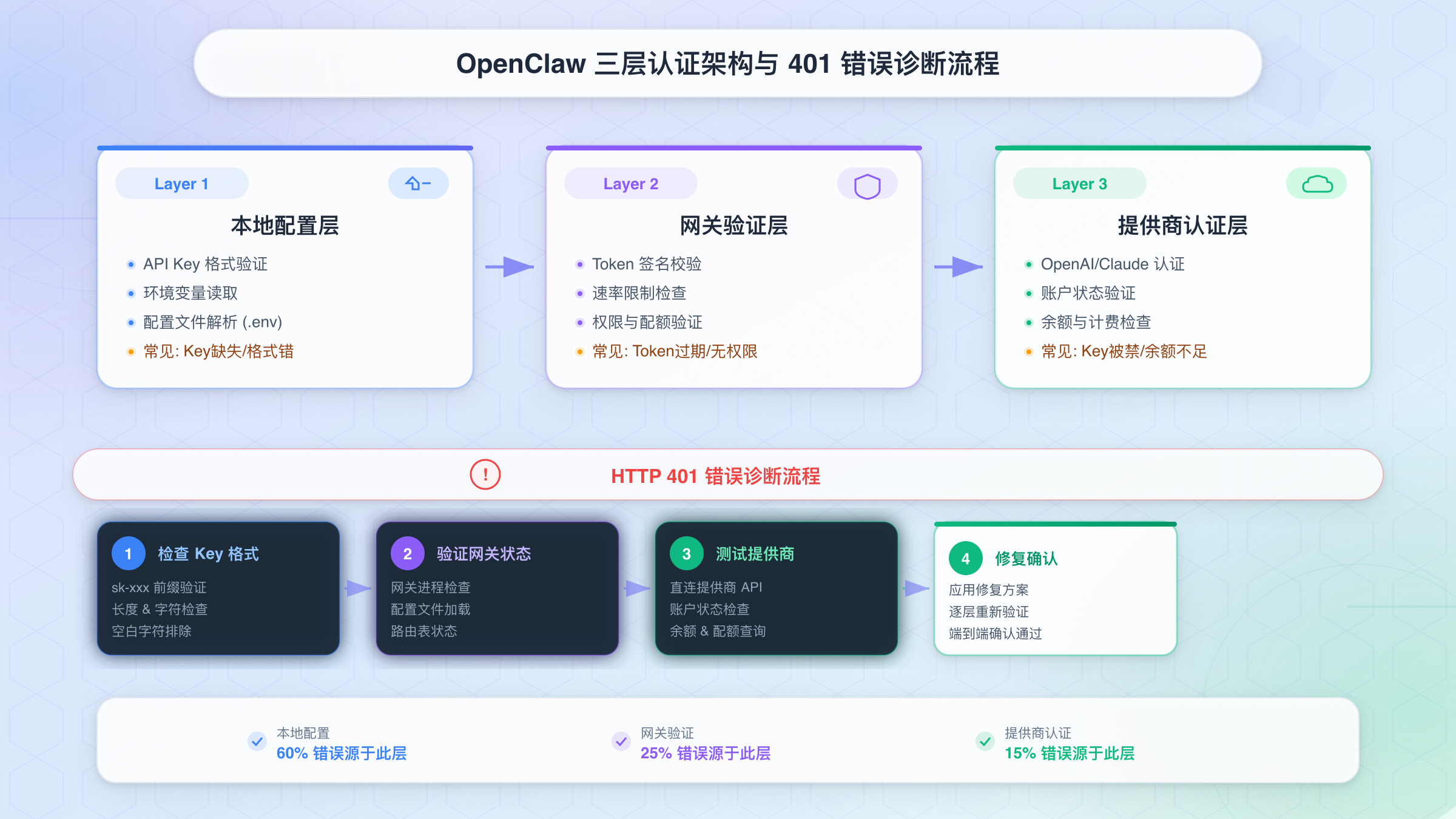 本文将从OpenClaw的三层认证架构出发,系统性地解析导致401错误的6种根本原因,并提供经过验证的修复方案。无论你是首次安装遇到问题,还是配置变更后突然认证失败,都能找到对应的解决路径。
