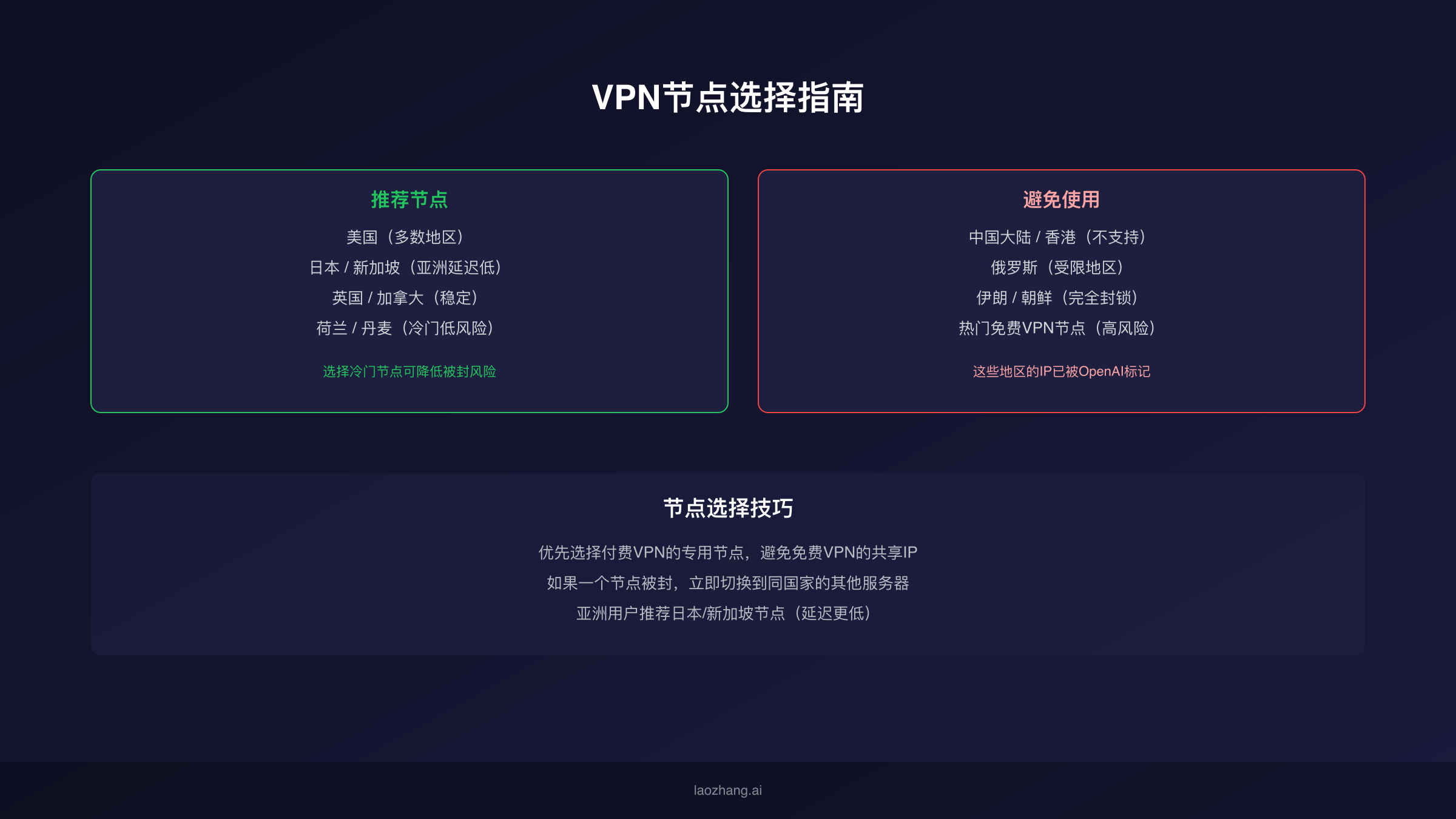 应该避免的节点包括中国香港(OpenAI明确不支持)、俄罗斯(受限地区)、以及免费VPN服务的所有节点。免费VPN的IP地址几乎全部在Cloudflare的黑名单中,因为这些IP被大量用户共享且缺乏维护。如果你正在使用免费VPN,这很可能就是你无法访问ChatGPT的直接原因。如果你的Cursor编辑器也遇到了类似的地区限制问题,可以参考Cursor地区限制VPN配置指南。