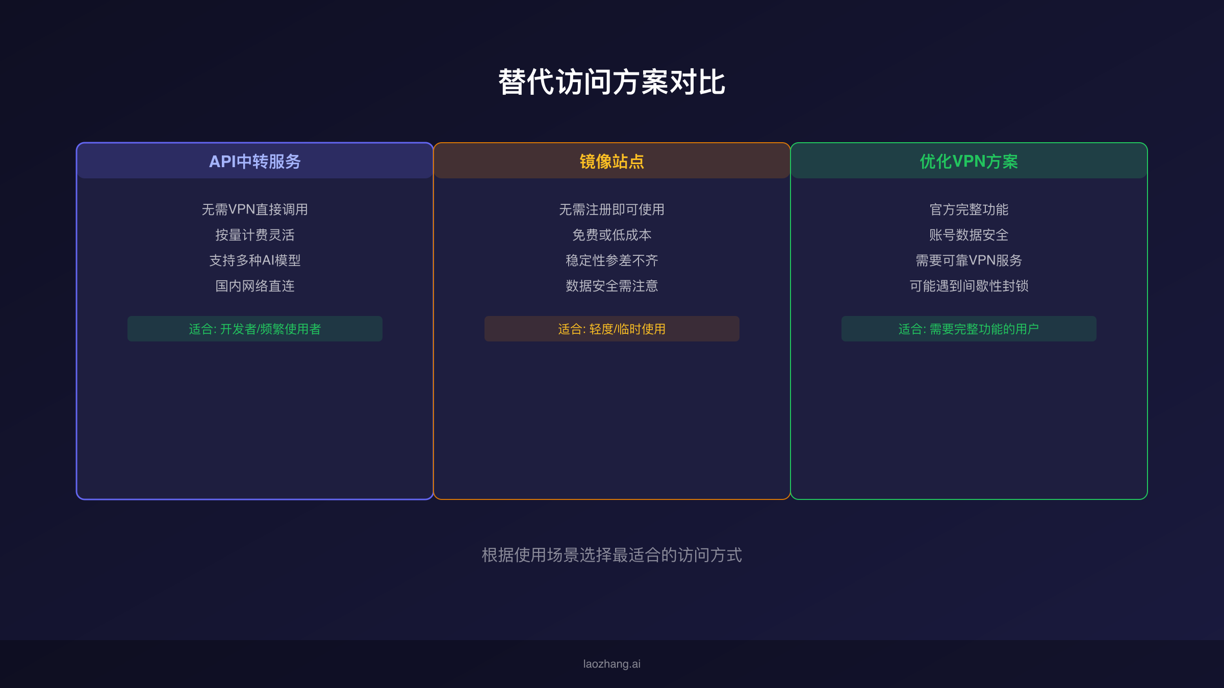 如果VPN方案长期不稳定,或者你不想每次使用ChatGPT都折腾VPN设置,以下替代方案可以完全绕过VPN的需求。每种方案各有优劣,选择哪个取决于你的使用场景和技术水平。